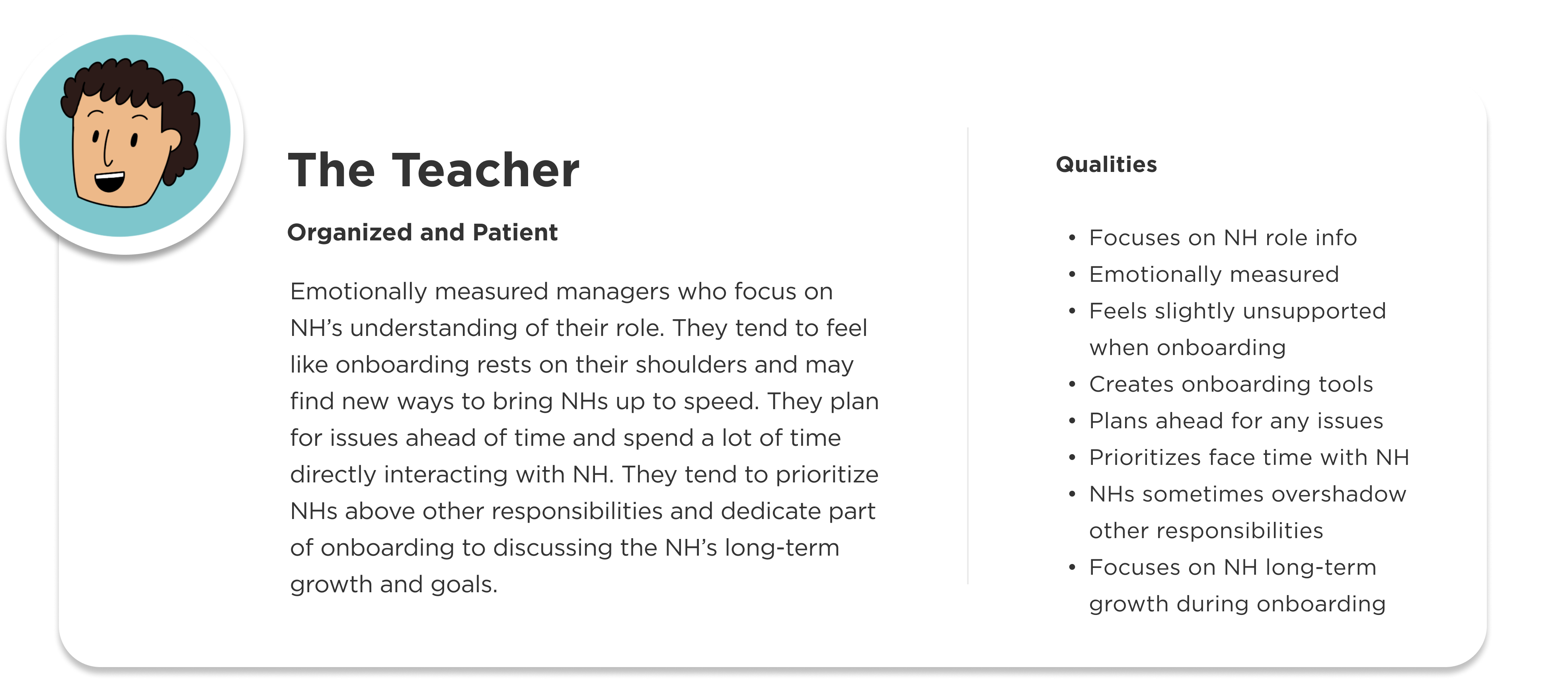 Adding archetypes to the service blueprint helps to understand how different behavioral patterns experience the onboarding process differently. The archetypes and service blueprint inform future onboarding projects, improving the process for new hires and their managers.